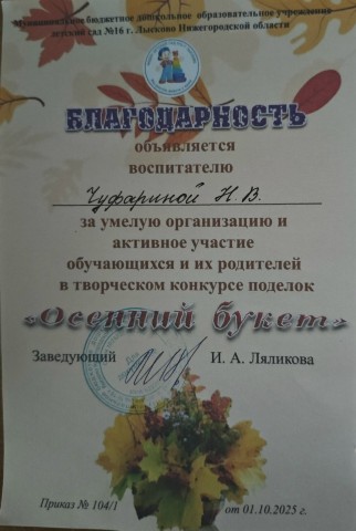 Благодарность за умелую организацию и активное участие обучающихся и их родителей в творческом конкурсе поделок "Осенний букет"