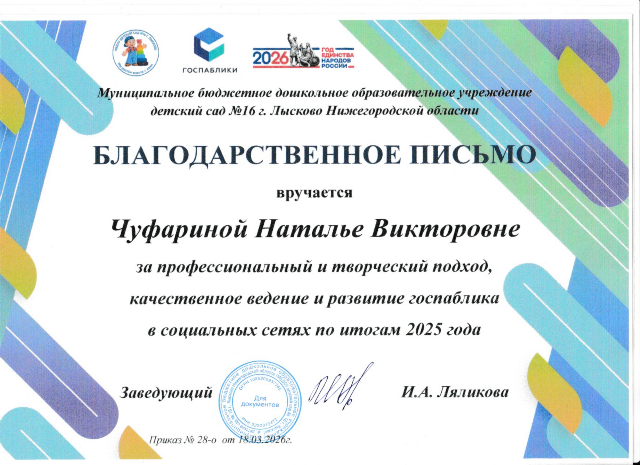 Благодарственное письмо за профессиональный и творческий подход, качественное ведение и развитие госпаблика в социальных сетях по итогам 2025 года