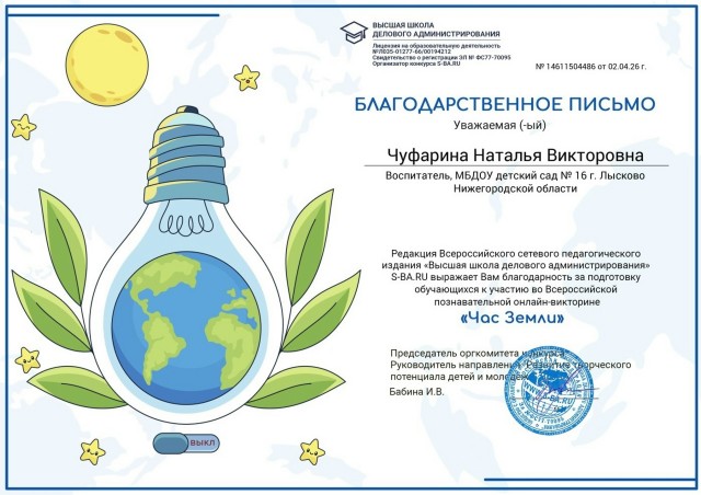 Благодарственное письмо за подготовку обучающихся к участию во Всероссийской познавательной онлайн-викторине "Час Земли"