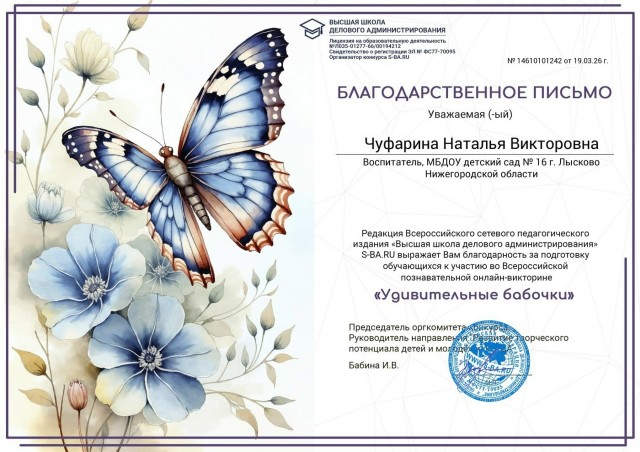 Благодарственное письмо за подготовку обучающихся к участию во Всероссийской познавательной онлайн-викторине "Удивительные бабочки"