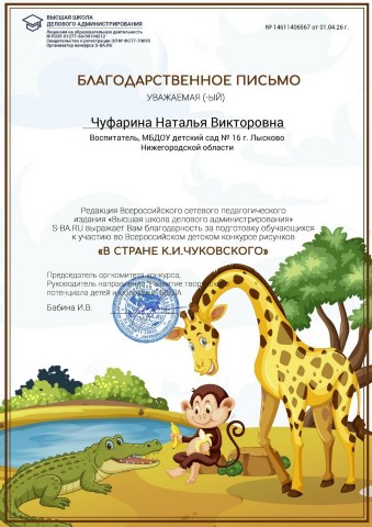 Благодарственное письмо за подготовку обучающихся к участию во Всероссийском детском конкурсе рисунков "В стране К. И. Чуковского"
