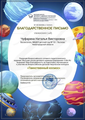 Благодарственное письмо за подготовку обучающихся к участию во Всероссийском детском творческом конкурсе "Таинственный космос"