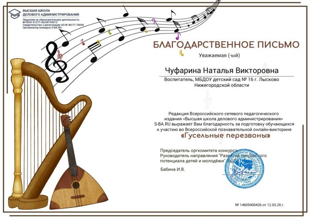 Благодарственное письмо за подготовку обучающихся к участию во Всероссийской познавательной онлайн-викторине "Гусельные перезвоны"