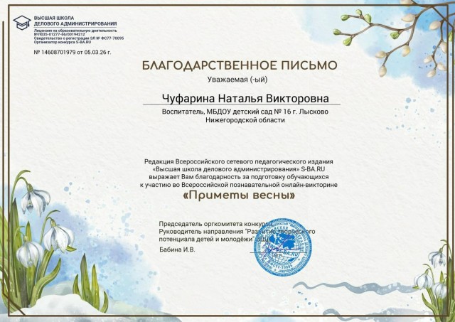 Благодарственное письмо за подготовку обучающихся к участию во Всероссийской познавательной онлайн-викторине "Приметы весны"