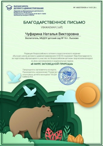 Благодарственное письмо за подготовку обучающихся к участию во Всероссийском детском творческом конкурсе ко дню заповедников и национальных парков "В мире заповедной природы"
